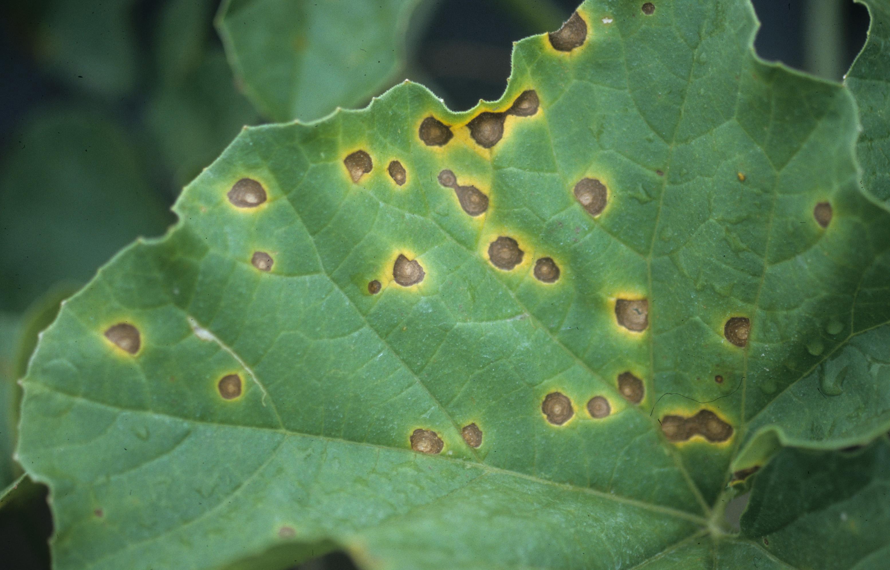 Anthracnose (Colletotrichum orbiculare) is most common on cucumber, muskmelon, gourds, and watermelon. All aboveground plant parts can be affected. Disease may become more severe in late summer, especially if the weather is rainy. Small, circular lesions develop initially on leaves. These lesions enlarge to form large tan to brown spots that may coalesce to create extensive blighting. On watermelon, leaf lesions tend to be smaller, irregularly shaped, and darker in color. The centers of older lesions may crack or fall out entirely. Lesions on stems are tan-brown, somewhat elongated, and sunken. Girdling stem lesions result in vine wilting. On maturing fruit, lesions appear as small, circular, sunken areas. Lesions may grow to 1" or larger on melons. Lesions on watermelon can be cracked and irregularly shaped. Under humid conditions, lesions will blacken and salmon-pink masses of spores develop.