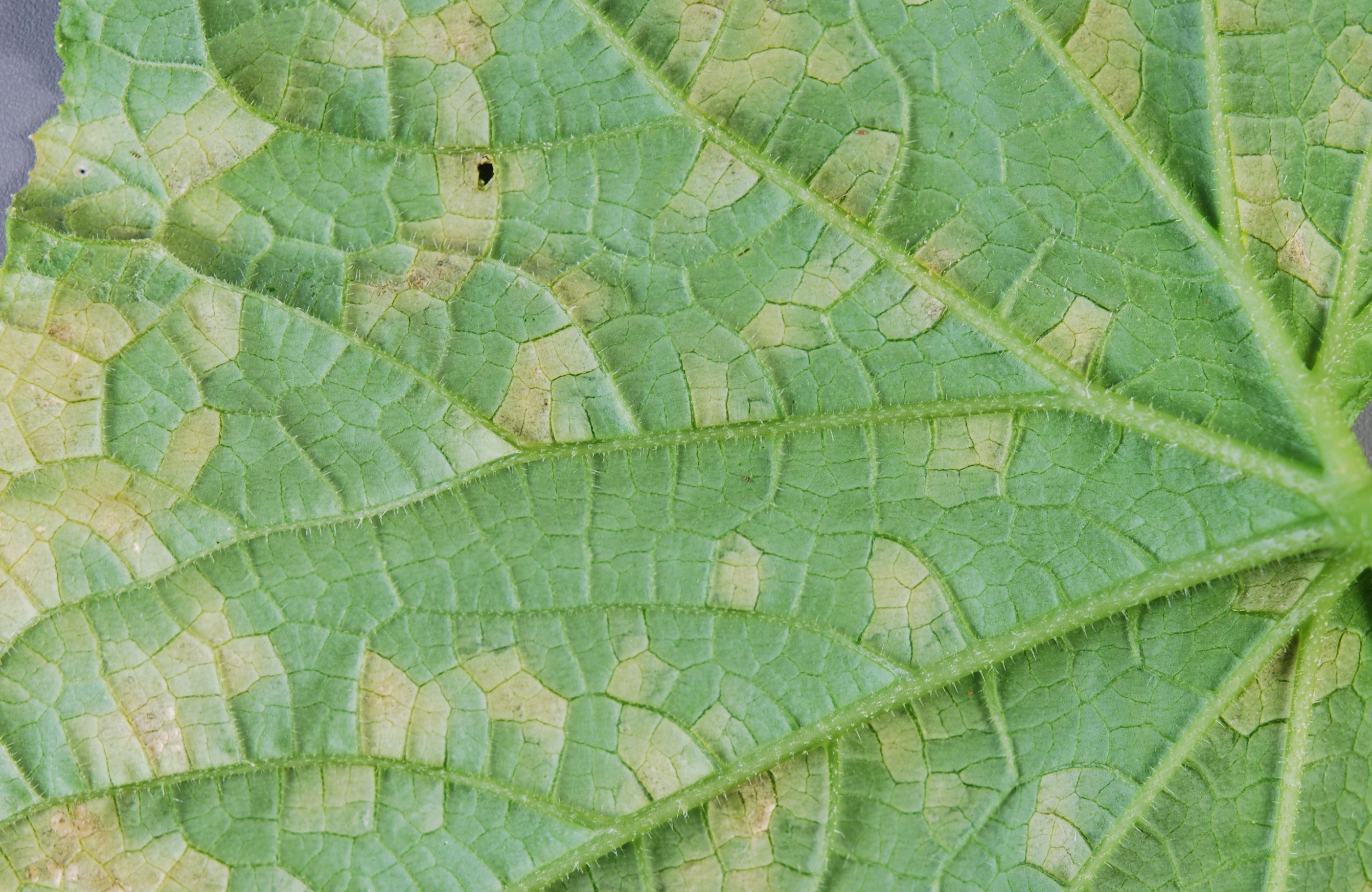 Downy mildew on lower side of cucumber plant foliage.